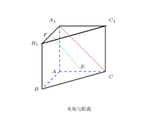 1. 一个直三棱柱体,如下图所示,其中\overline{AB}\perp\overline{AC}E\overline{AC}的中点,F\overline{A_1B_1}的中点。已知|\overline{AB}| = |\overline{AC}| = 4|\overline{AA_1}| = 6。求\overline{EF}\overline{A_1C}的夹角与距离.