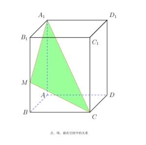 2. 一个长方体,如下图所示,已知|\overline{AB}|=3|\overline{AD}|=4|\overline{AA_1}|=7|\overline{BM}|=2。求三角形A_1MC的面积,以及点A到三角形A_1MC的距离.